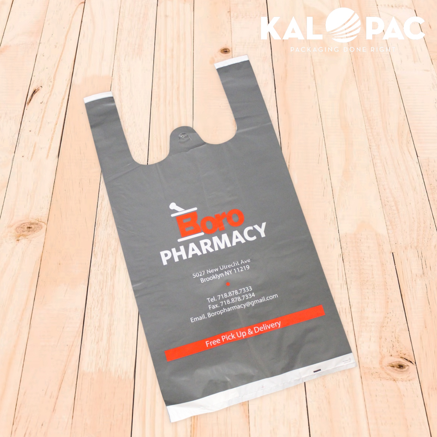 The most common, economical and versatile bag for all uses. T-shirt bags are made with a 2 strap handle in a wide array of header types and usually have a pinch bottom or bottom gusset with square heat seal. Popular for everything from retail, take out, and grocery. These bags will fit any need. They can fit different bag holder racks or be produced as loose packed, easy-to-grab bags.