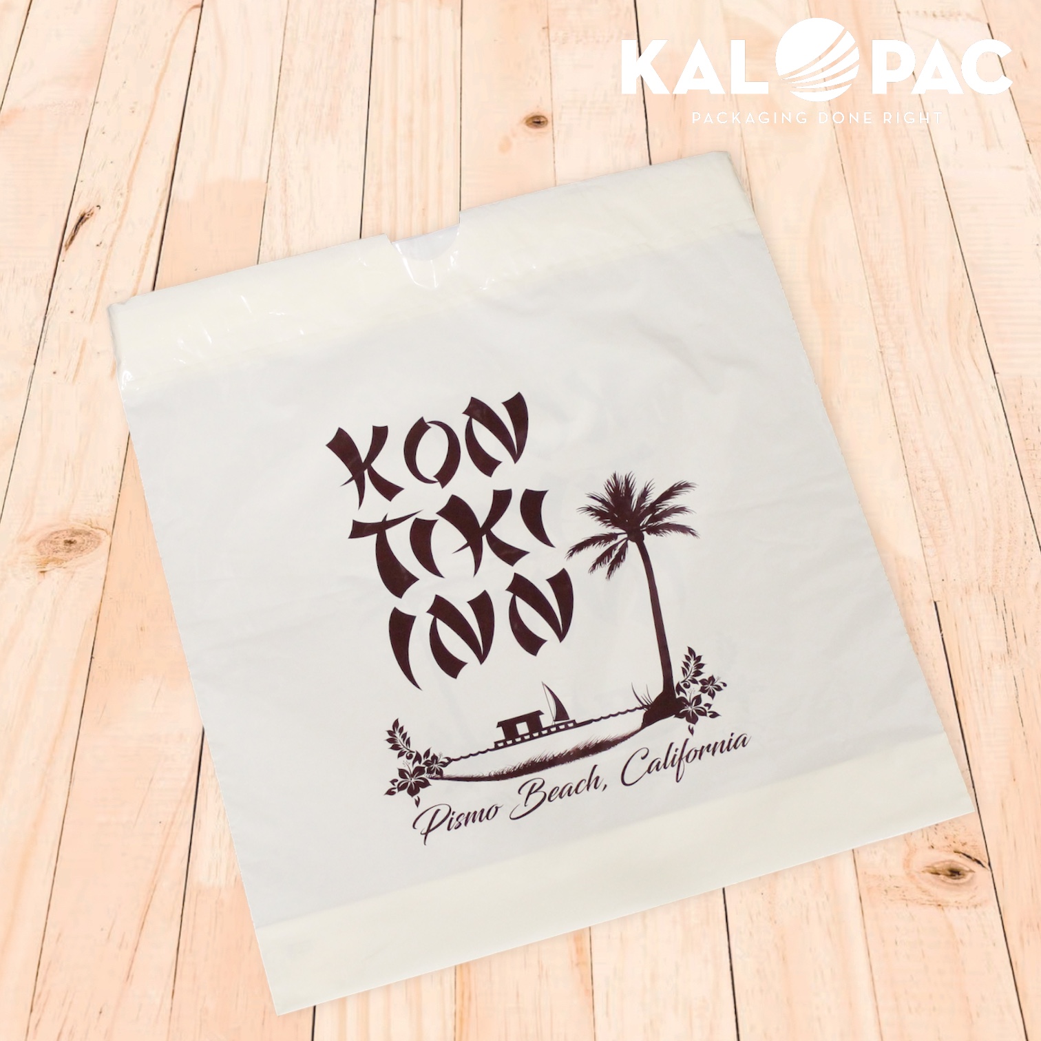 These bags are a fun and effective way to secure and showcase your brand. They are mostly seen as flat or bottom gusseted bags, and made with a strip of film that pulls to tighten around the opening of the bag to create a loop handle that helps to seal contents inside. The drawtape can match the plastic being used for the bag itself or even be a different color film. Drawtape bags are the perfect solution for the hospitality industry, retail stores, and trade shows.
