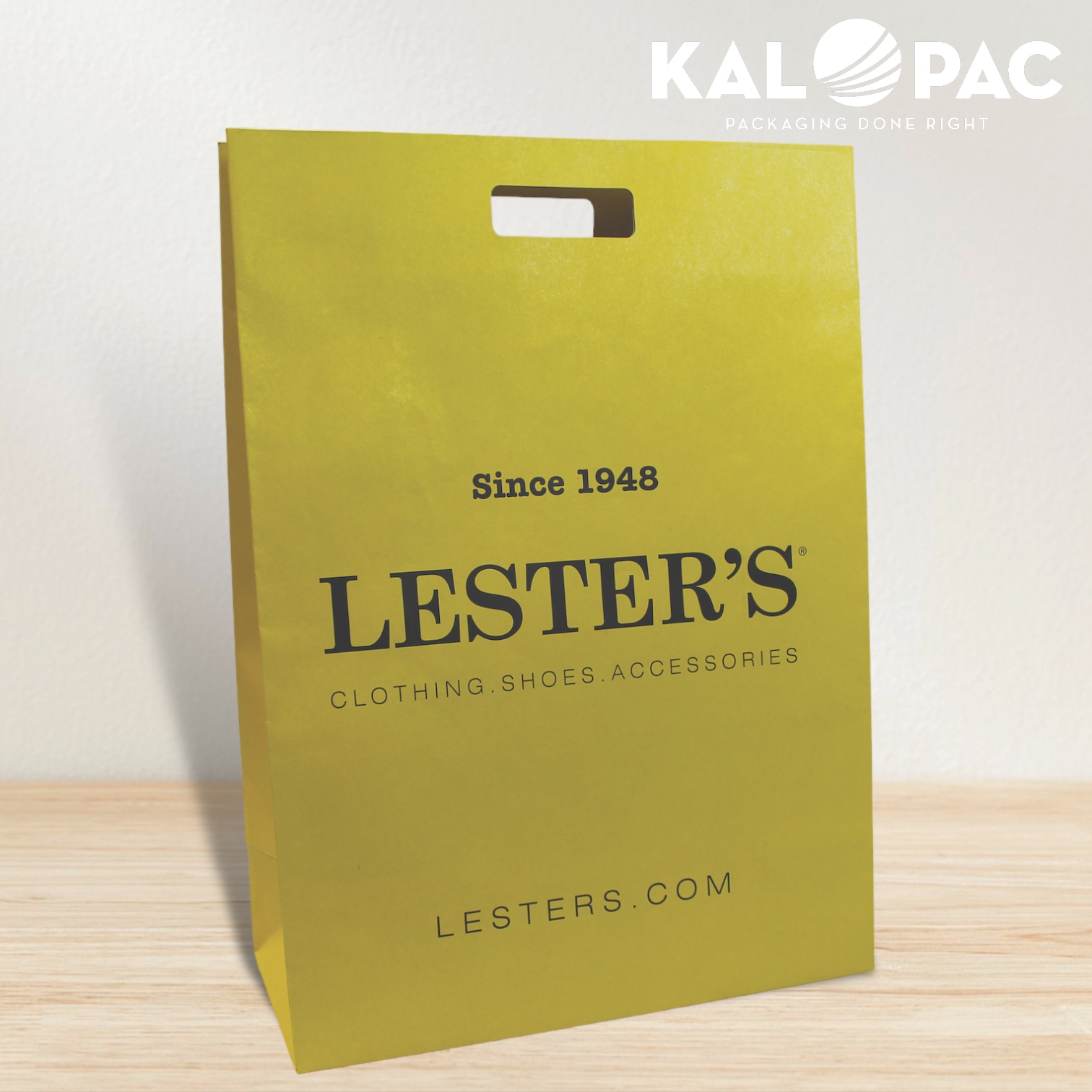 A Foldover Die Cut handle is also available for paper bags. Typically about 3" of extra paper is folded over the top horizontally and an oval die cut is then punched through the reinforced faces of the bag as the handle. The extra support of this handle type makes it a more stable option for heavier items and adds a classing look to your packaging.