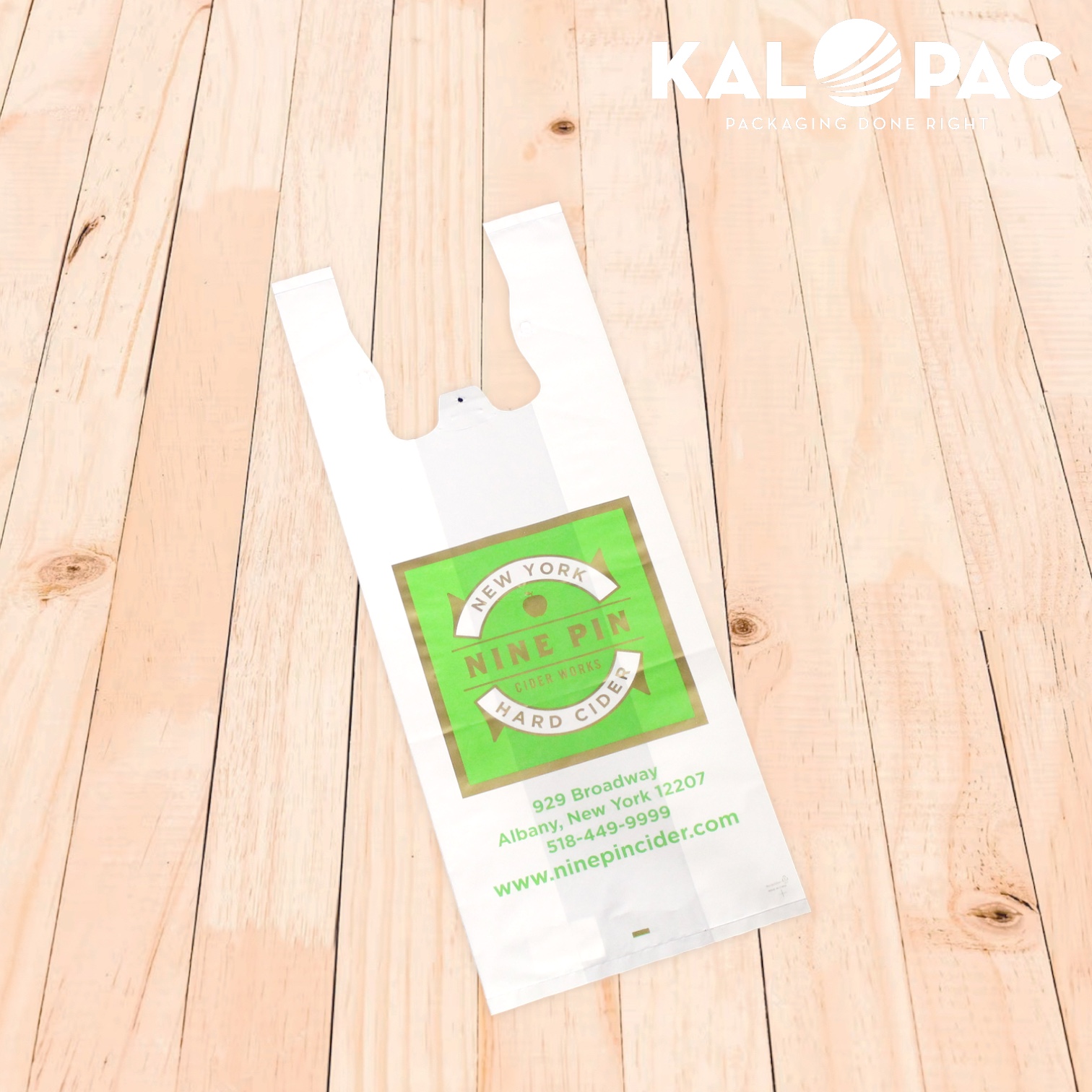 The most common, economical and versatile bag for all uses. T-shirt bags are made with a 2 strap handle in a wide array of header types and usually have a pinch bottom or bottom gusset with square heat seal. Popular for everything from retail, take out, and grocery. These bags will fit any need. They can fit different bag holder racks or be produced as loose packed, easy-to-grab bags.