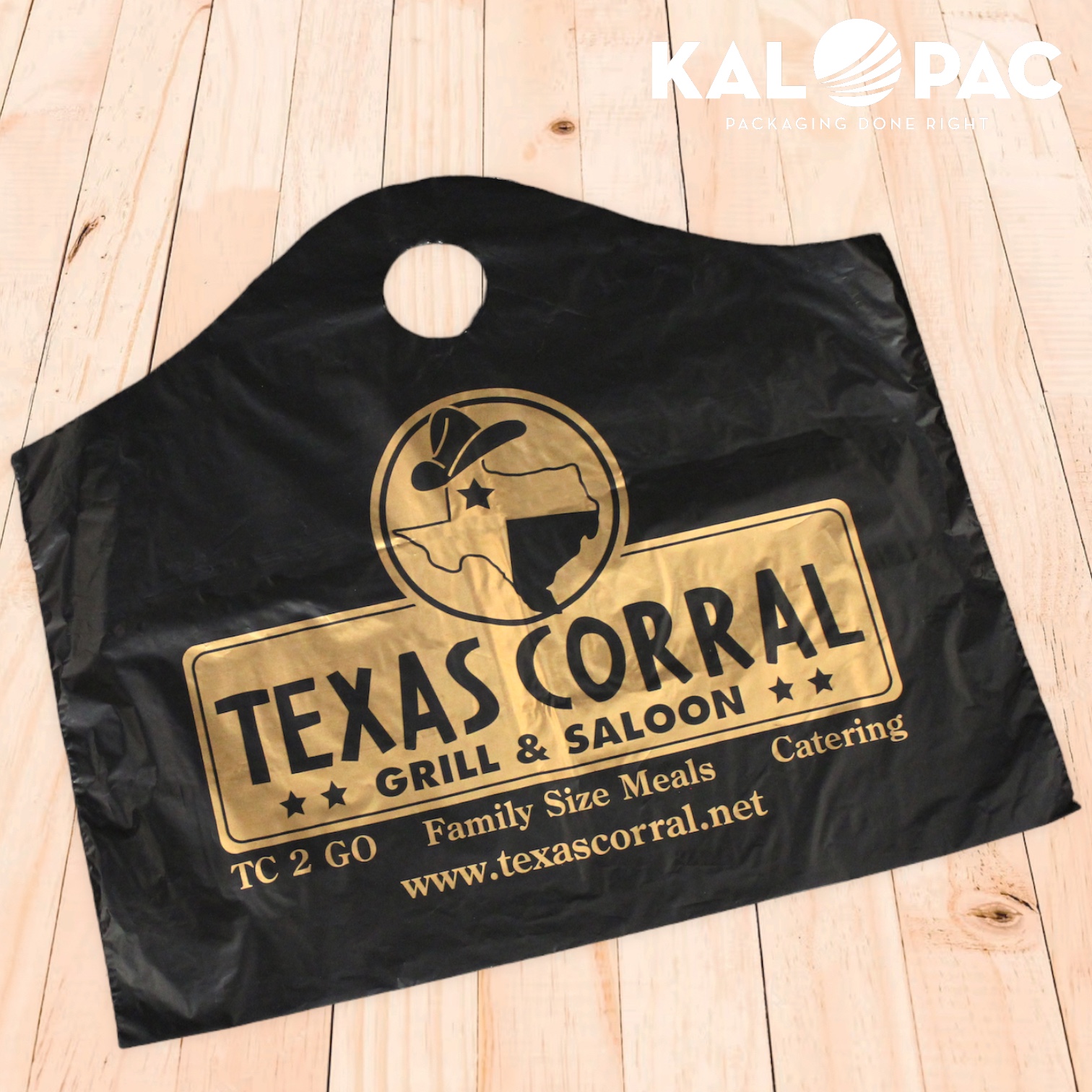 Commonly seen as take out bags, these include a wavy shape top handle with round circle die cut. Usually, they are made as side seal bags with expandable bottom gussets that help the bag stand on its own and are perfect to fit wider items. They are ideal for easily stacking food containers; and resist stretching and tearing easily. This makes them leak resistant and better for carrying larger items.