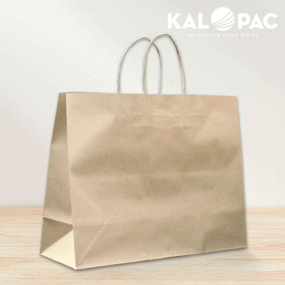 Our Natural Kraft Stock Bags are great for retail, giveways, takeout and catering. All bags are unlaminated with a twisted paper handle, and composed of FSC Certified 100% post-consumer recycled paper, and is 100% recyclable. Black logo printed in bottom gusset and no cardboard bottom.