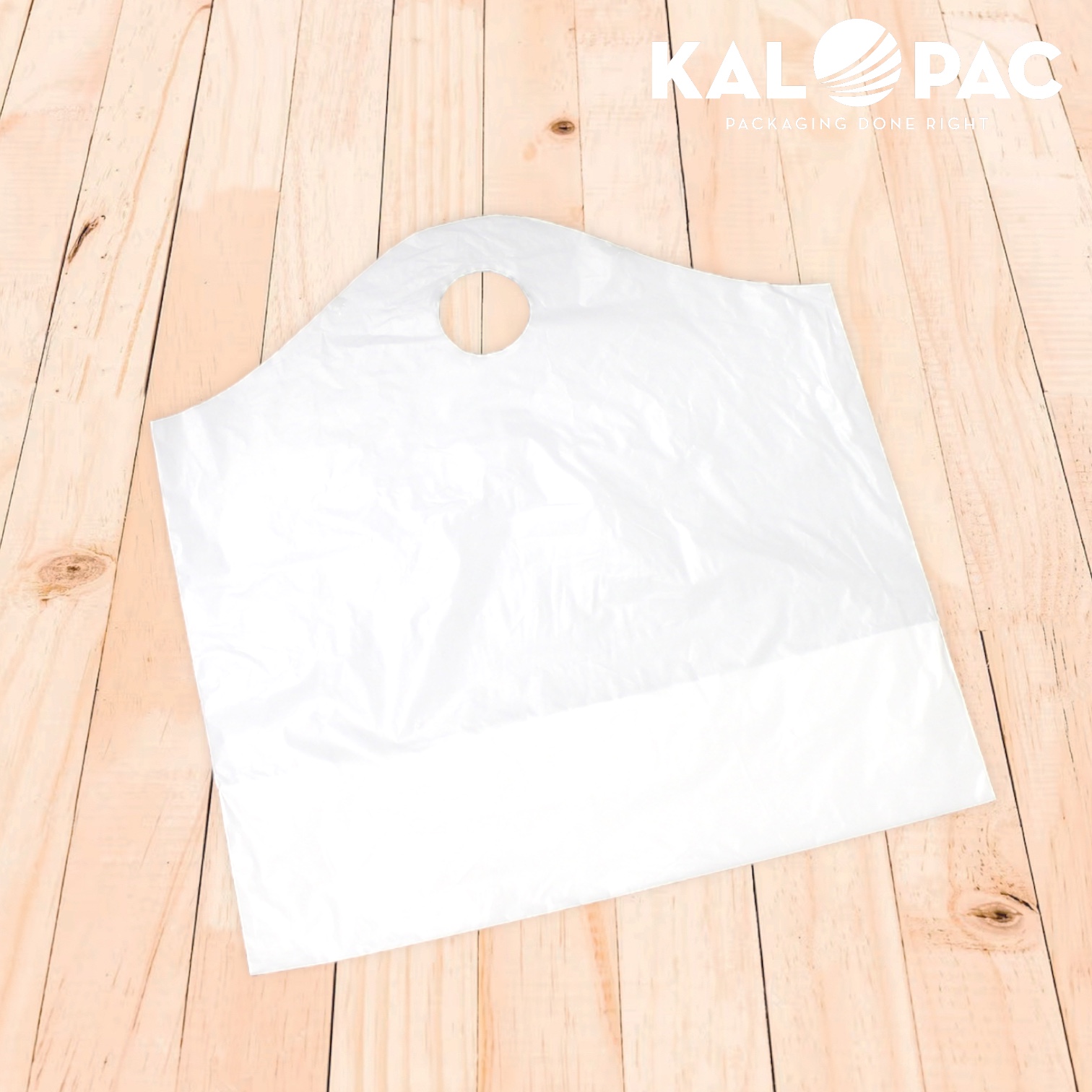 Commonly seen as take out bags, these include a wavy shape top handle with round circle die cut. They are made as side seal bags with expandable bottom gussets that help the bag stand on its own and are perfect to fit wider items. They are ideal for easily stacking food containers; and resist stretching and tearing easily. This makes them leak resistant and better for carrying larger items.