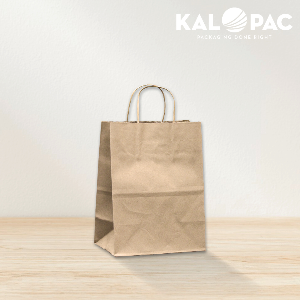 Our Natural Kraft Stock Bags are great for retail, giveways, takeout and catering. All bags are unlaminated with a twisted paper handle, and composed of FSC Certified 100% post-consumer recycled paper, and is 100% recyclable. Black logo printed in bottom gusset and no cardboard bottom.